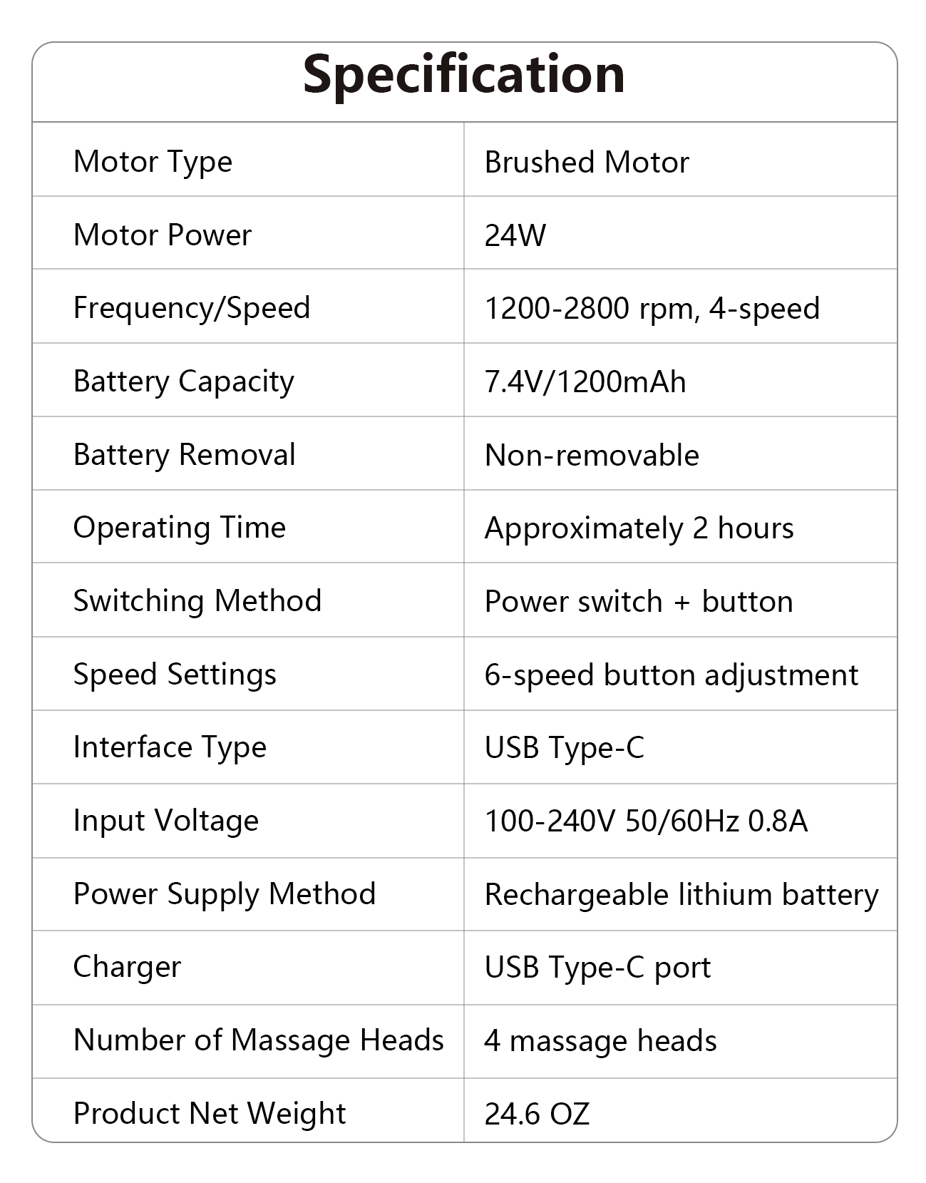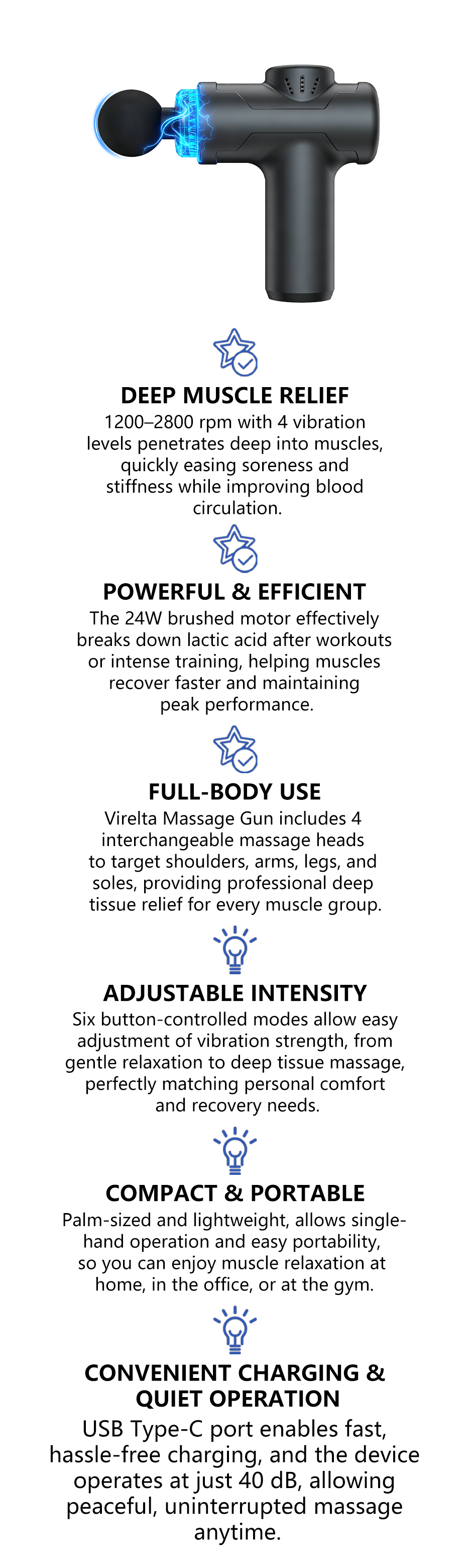 Powered by a 7.4V 1200mAh rechargeable lithium battery, Virelta delivers stable, long-lasting performance for multiple sessions on a single charge. Enjoy a soothing massage anywhere—whether at the gym, at work, or while traveling. With a convenient USB Type-C port, recharging is effortless, so your relaxation never gets interrupted.