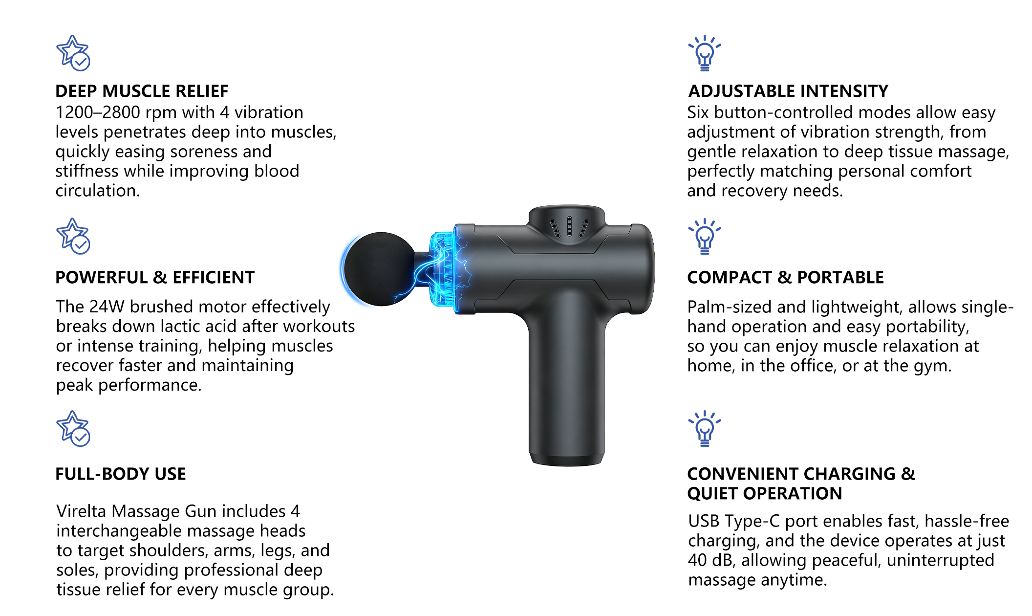 Virelta features six adjustable speed levels ranging from 1200 to 2800 RPM, allowing you to tailor the intensity to your body’s needs. Whether you’re warming up before a workout, easing post-exercise soreness, or simply relaxing after a long day, each level provides the right balance of power and comfort for a deeply personalized massage experience.